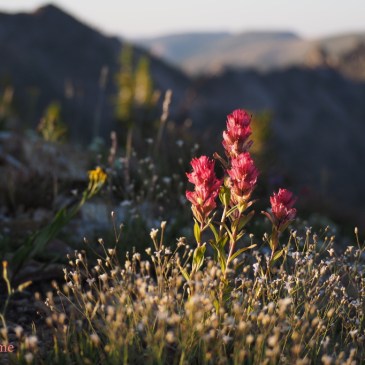 Indian Paint brush at sunset. Elk summit, above the South Fork Salmon, and Big Creek, in central Idaho, U.S.A. I am having trouble identifying the white flower, possibly native Baby’s Breath. Wolf Fang peak, and the Wolf Fangs, are in the background.
